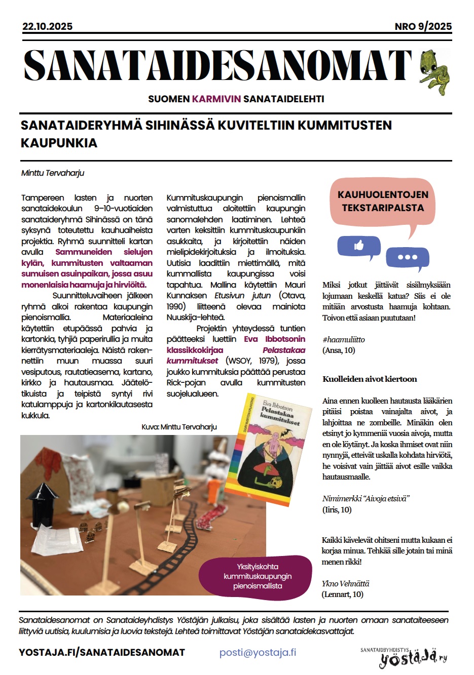 Lokakuun karmivien Sanataidesanomien aiheina muun muassa sanataidekoululaisten kauhuprojektit sekä Kirjalitta-festivaali ja siihen liittyvä kirjoituskilpailu. Lataa lehti pdf-tiedostona tältä sivulta.
